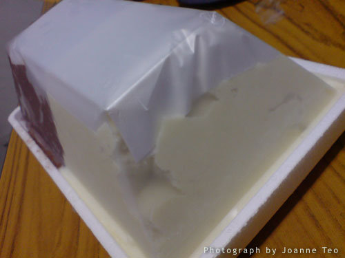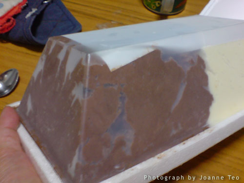 Haato keeps the ice cream in this styrofoam package which really keeps the ice cream cool. A half hour ride in the car and only the top bit was slightly melted. Nice.