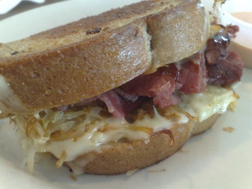 Reuben sandwich for lunch. It’s sauerkraut and corned beef with a side of thousand island cream and a side of chilli (considered a soup). A creation of Nebraska.