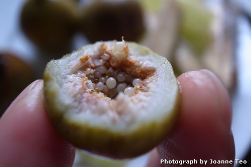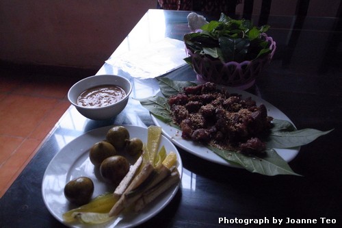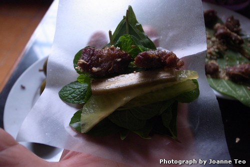 It comes as a set with rice paper, a basket of various leaves (mint and basil are the only ones I can identify), the said grilled goat meat that looked like stay chunks, dipping sauce that was a little sweet and sour and was had a kick that came a little after eating, probably due to it containing ginger and a plate of fresh starfruit, guava and pickled figs. The figs, you eat on its own. The rest goes in a roll.