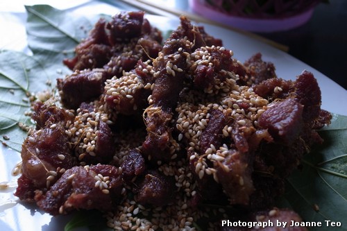 The goat is covered in sesame seeds, but I think those seeds are fried in garlic and salt. It was very tasty. The goat was marinated with spices and lemongrass.